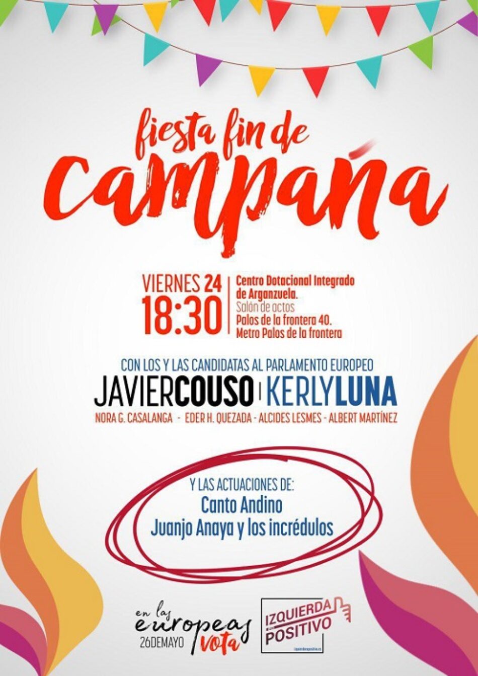 El próximo viernes 24 de mayo la candidatura de Izquierda en Positivo al Parlamento Europeo, encabezada por Javier Couso, celebrará su fiesta de fin de campaña en el Salón de Actos del Centro Dotacional Integrado de Arganzuela (Palos de la Frontera, 40).