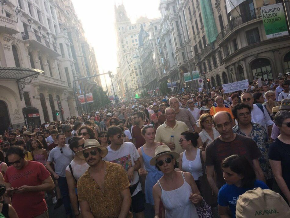 Las irrespirables temperaturas de la capital no impidieron que decenas de miles de personas marchasen en defensa de Madrid Central en la tarde de ayer. Con los termómetros marcando más de 40º en las marquesinas de las paradas de autobus, un clamor multitudinario recorrió las principales calles del centro de la ciudad defendiendo la limitación del tráfico en la denominada «almendra central».