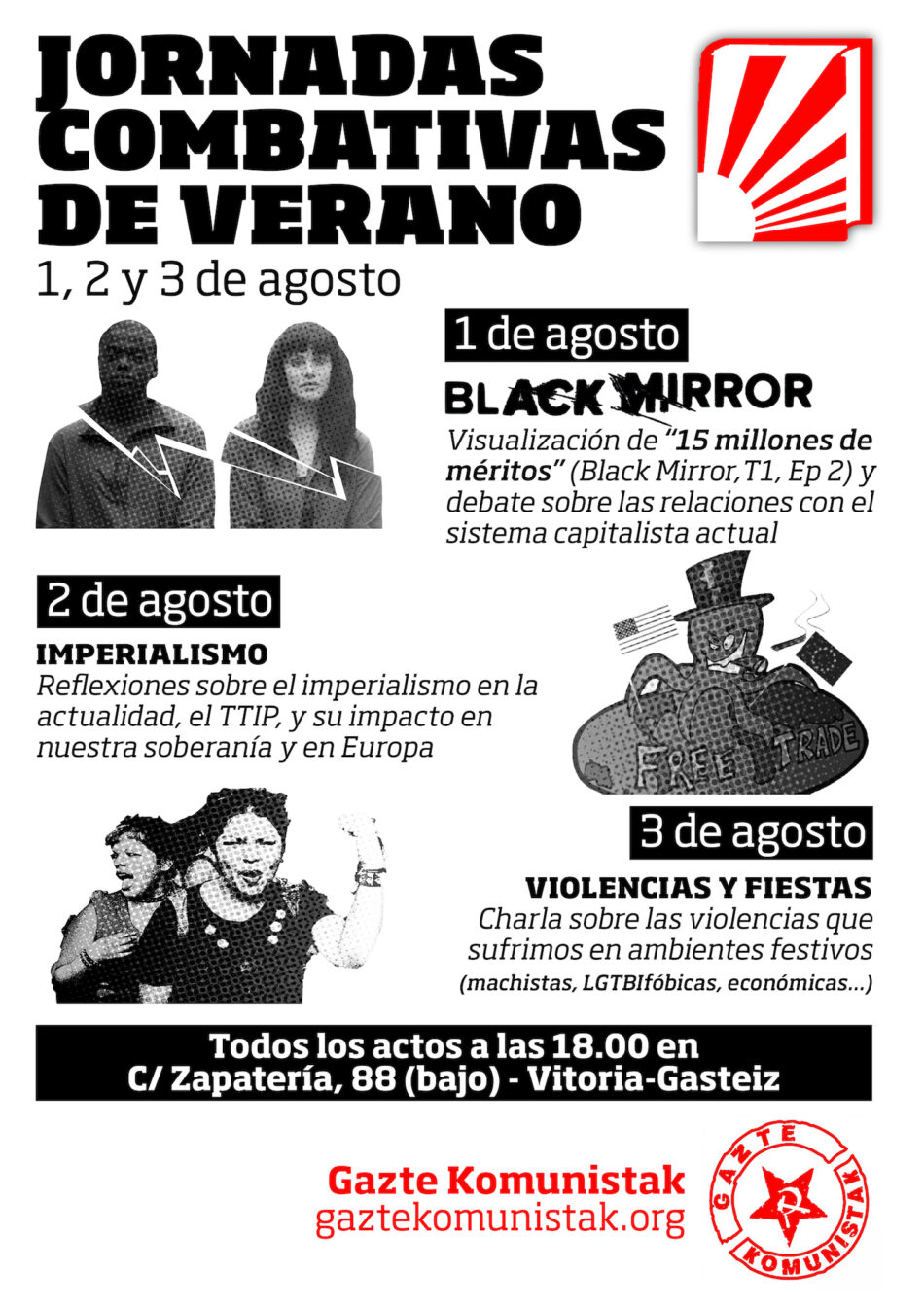 Las Jornadas Combativas de Verano tendrán lugar en Vitoria-Gasteiz, en la sede de Gazte Komunistak, (Calle Zapatería, 88, bajo), el 1, 2 y 3 de agosto a las 18.00, e instan a la juventud gasteiztarra a participar de ellas y aportar con sus reflexiones.