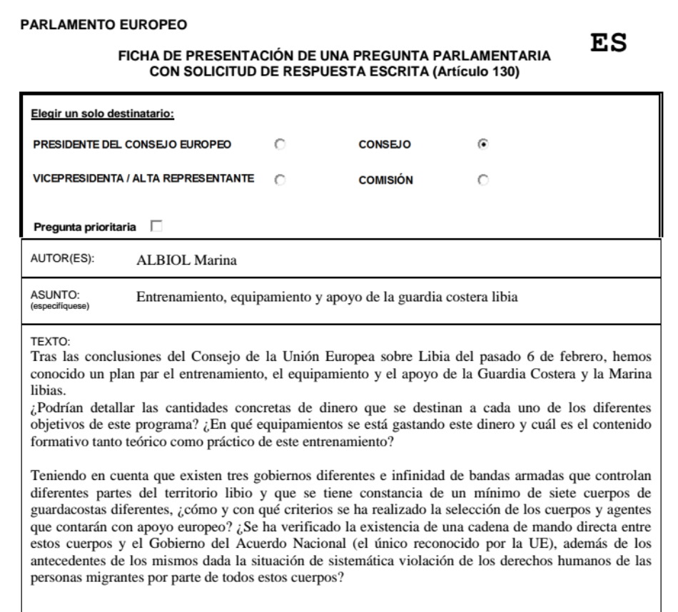 La portavoz de Izquierda Unida en el Parlamento Europeo, Marina Albiol, ha requerido al Consejo Europeo que haga pública toda la información sobre los grupos de guardacostas libios a los que va a entrenar la Unión Europea y ante qué autoridad responden, así como los manuales, el material y las cantidades exactas que se van a destinar en el marco del acuerdo con Libia, anunciado el pasado fin de semana por los jefes de Estado y Gobierno comunitarios tras la cumbre de La Valeta.