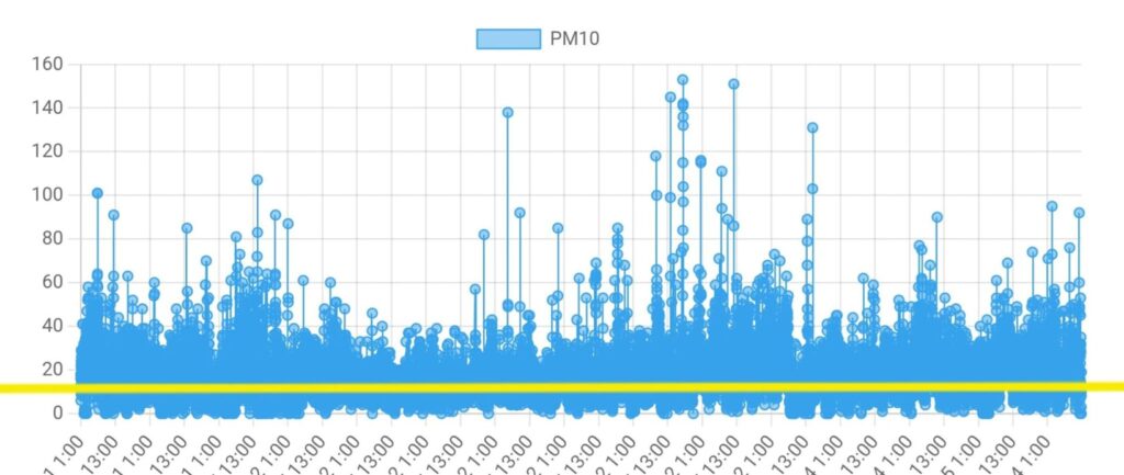Contaminación por partículas PM10 (un año), estación del CIMA en Plaza de las Estaciones de Santander, nivel de la OMS 15 microgr/año (línea amarilla). No son episodios puntuales, sino una exposición severa y mantenida y ahí se ubica un parque infantil.