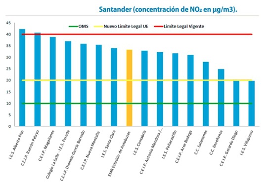 Datos de las mediciones NO2 realizadas por Ecologistas en Acción en los entornos de los centros escolares de Santander. En todos los entornos escolares se incumplen los niveles de la OMS.