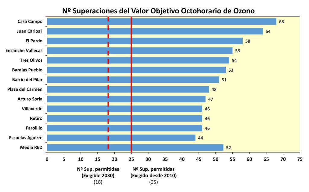 En cuanto a la contaminación por ozono troposférico, las 13 estaciones de la red que miden dicho contaminante registraron números de superaciones del valor objetivo octohorario (número de días con 8 horas seguidas por encima de 120 µg/m3), holgadamente por encima de las 25 superaciones anuales que permite la legislación europea. Esta superación generalizada del valor objetivo en todas las estaciones solo había ocurrido anteriormente una vez, en 2024, y ha vuelto a suceder en 2025, con un mayor número total de superaciones en el conjunto de la red (680 superaciones en 2025 frente a las 648 de 2024). El valor medio de la red registró 52 superaciones del valor objetivo octohorario, más del doble de las 25 superaciones permitidas por la legislación. Así pues, puede afirmarse que la ciudad de Madrid se encuentra en estos momentos estructuralmente fuera de los valores marcados por la legislación europea en relación con la contaminación por ozono, con una fuerte tendencia al alza que de momento no ha encontrado techo.