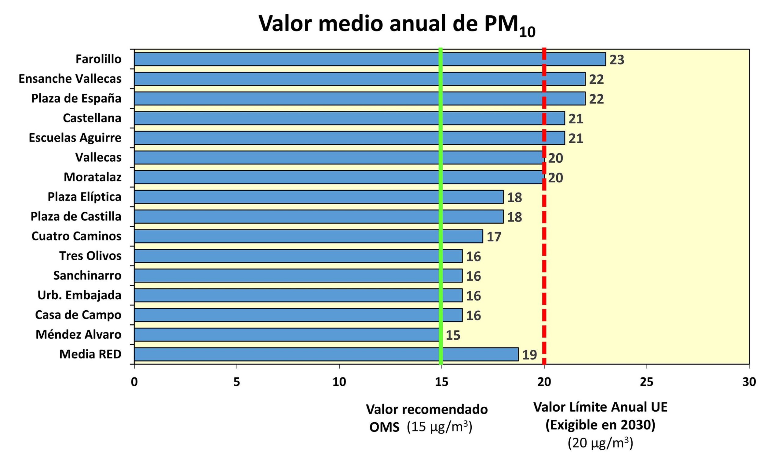 - Madrid se encuentra lejos de cumplir con los estándares marcados por la nueva directiva europea de calidad del aire, así como con los valores guía de la OMS, para NO2, ozono troposférico y partículas en suspensión, por lo que Ecologistas en Acción de Madrid ciudad considera que «el conformismo y autocomplacencia que muestra el Ayuntamiento de Madrid están fuera de lugar».