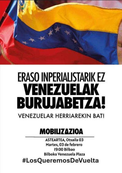 En el ámbito internacional, varias ciudades europeas acogerán movilizaciones de solidaridad con el pueblo venezolano. En Bilbao, la concentración tendrá lugar en la Plaza Venezuela a las 19:00 horas, mientras que en Madrid se celebrará en la Puerta del Sol a la misma hora.