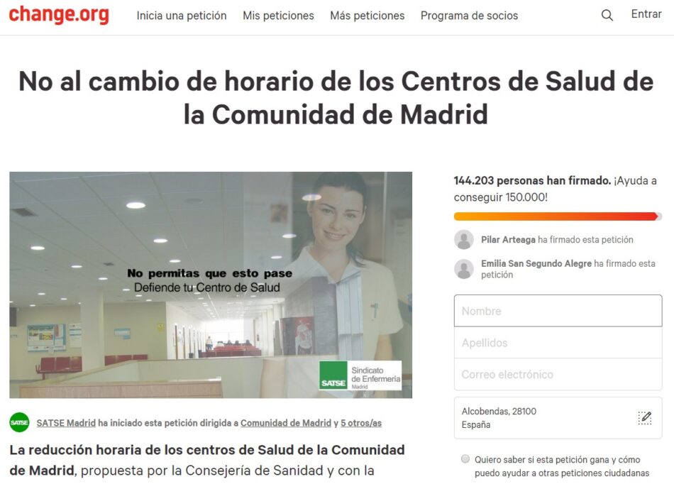 Madrid, 3 de mayo de 2019.- Ya son casi 150.000 las firmas alcanzadas por SATSE Madrid en Change.org (https://www.change.org/p/no-al-cambio-de-horario-de-los-centros-de-salud-de-la-comunidad-de-madrid) reclamando al Gobierno de la Comunidad el mantenimiento del horario en los centros de salud. Ante la sospecha de que el PP tuviera la intención de volver a reactivar esta iniciativa, contraria a los deseos de la mayoría de los madrileños, SATSE Madrid ha decidido reactivar la recogida de firmas en esta plataforma.