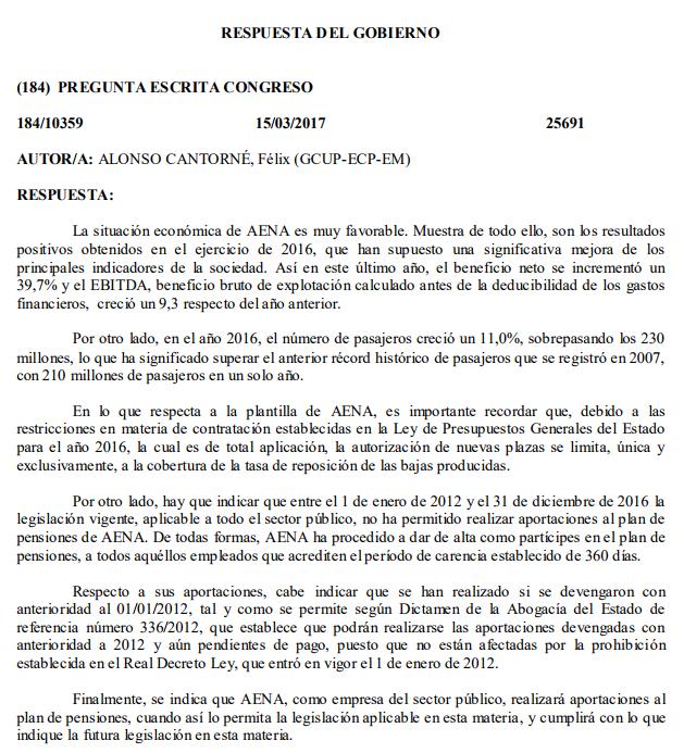Hemos tenido acceso a unas interesantes preguntas del Diputado Félix Alonso (Unidos Podemos) sobre AENA... con respuesta de la empresa.