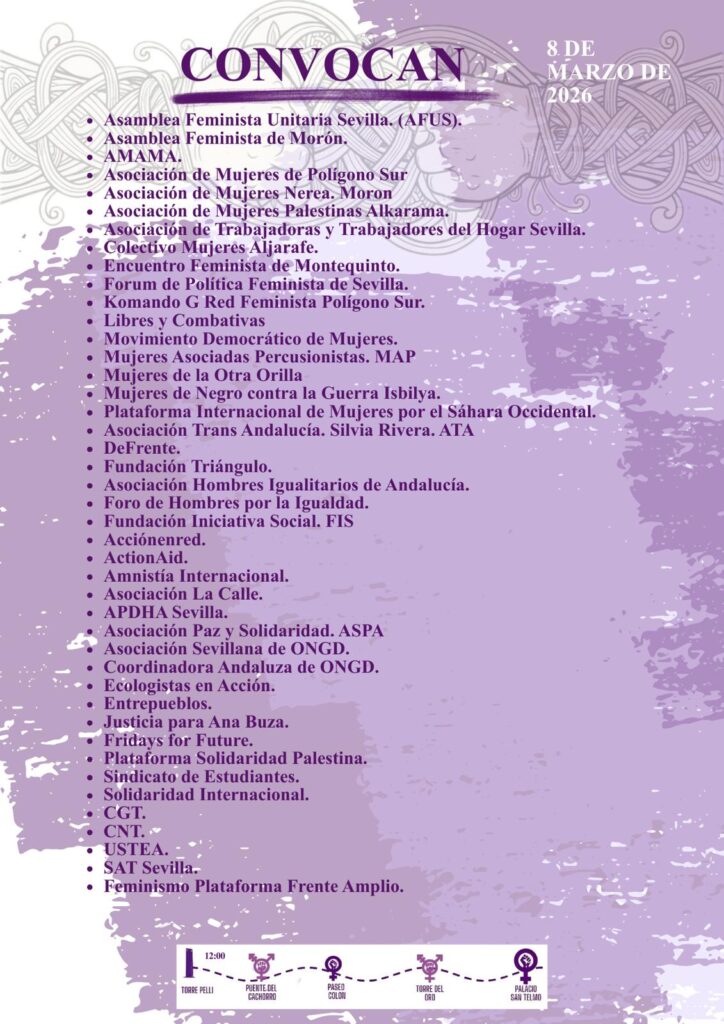 - La manifestación convocada por la Asamblea Feminista Unitaria de Sevilla está prevista para las 12:00 h del domingo 8 de marzo, partiendo desde la zona de Torre Pelli en Sevilla y discurriendo por el centro de la ciudad.