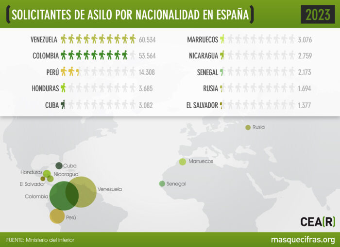 Venezuela (60.534), Colombia (53.564) y Perú (14.308) representan casi el 79% del total de solicitudes. Completan el listado de las diez primeras nacionalidades Honduras, Cuba, Marruecos, Nicaragua, Senegal, Rusia y El Salvador, confirmando un año más que la mayoría de las personas que solicitan asilo en España llegan a nuestro país a través de frontera aérea.