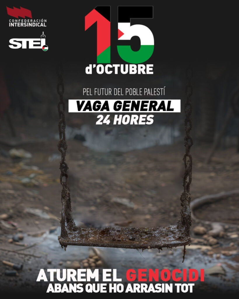 - CGT ya está llevando a cabo los trámites de la convocatoria de Huelga General, mientras que Solidaridad Obrera, Co.bas, Confederación Intersindical y AS la tienen formalizada. Es una huelga completamente legal que afecta y cubre todos los sectores laborales en España durante el 15 de octubre. A esta huelga general se suman convocatorias por territorios y paros concretos. Es la segunda huelga contra el genocidio en Palestina, que toma el relevo a la del 27 de septiembre de 2024.