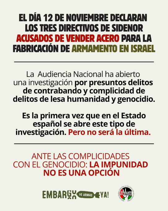 El próximo 12 de noviembre han sido citados a declarar a la Audiencia Nacional tres altos cargos de la empresa Sidenor. Los directivos de la empresa metalúrgica vasca han sido acusados de contrabando, según la Ley Orgánica de Represión de Contrabando, por la venta de acero a la empresa israelí IMI (Israeli Military Industries) para la fabricación de armamento. También de un delito de participación por complicidad en un crimen de lesa humanidad, recogidos en los artículos 29 y 607 bis y de genocidio del articulo 607 de Código Penal. La querella fue puesta por la Comunitat Palestina de Catalunya, la cual se presenta como acusación popular, en representación de la Campaña Fin al Comercio de Armas con Israel.