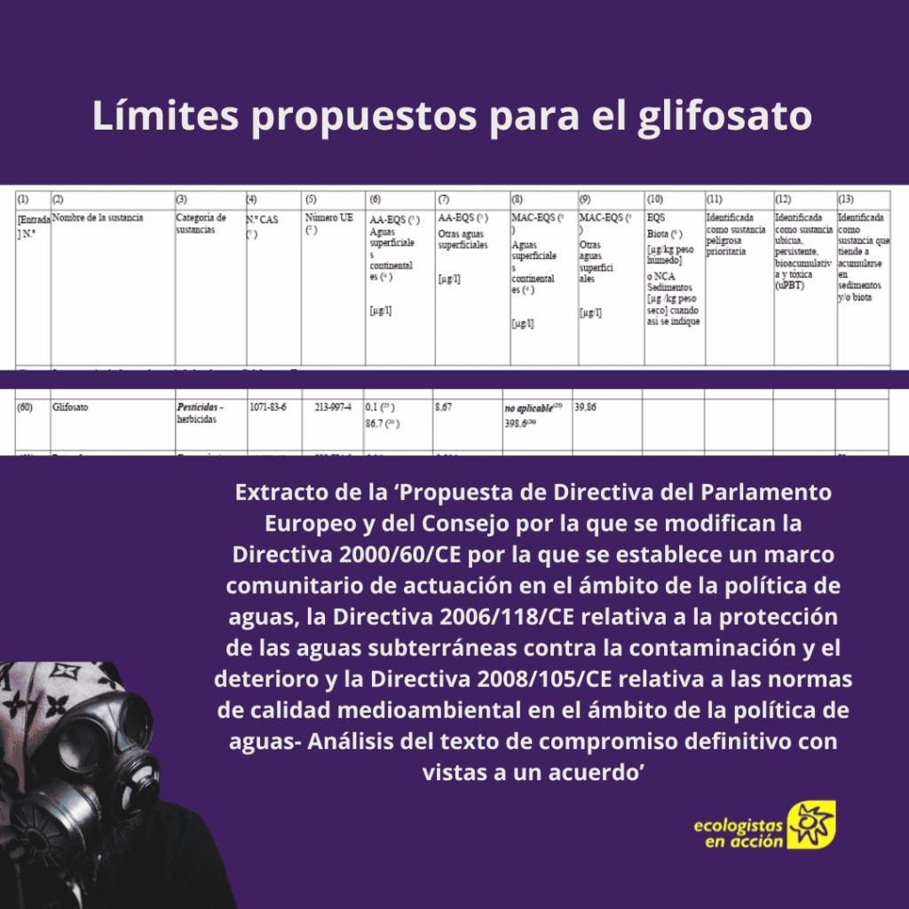 Ecologistas en Acción alerta al Ministerio para la Transición Ecológica y el Reto Demográfico (MITERD) de que aumentar 4.000 veces la cantidad legalmente permitida para el glifosato al trasponer la Directiva puede ser tentador, porque muchas aguas contaminadas aparecerían como legalmente limpias, pero en la práctica supondría permitir legalmente una contaminación muy elevada que pondría aún en mayor riesgo a las aguas españolas, un tercio de las cuales están contaminadas por este tóxico, según datos oficiales de glifosato en aguas españolas en los años 2021 y 2022 del propio MITERD que la organización recogió en su estudio ‘Nadando en glifosato’.