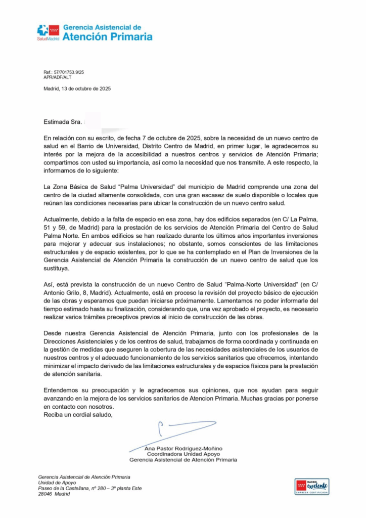 La última, con fecha 13 de octubre, es una carta de respuesta a las demandas del vecindario en la que la Comunidad acaba de admitir “las limitaciones estructurales y de espacio existentes” en los actuales centros de Atención Primaria de la zona y anuncia la construcción del nuevo centro de salud, sin comprometerse a ningún plazo y manteniendo la acostumbrada ambigüedad: “Lamentamos no poder informarle del tiempo estimado hasta su finalización, considerando que, una vez aprobado el proyecto, es necesario realizar varios trámites preceptivos previos al inicio de construcción de las obras”, indica la Consejería de Sanidad en su misiva.