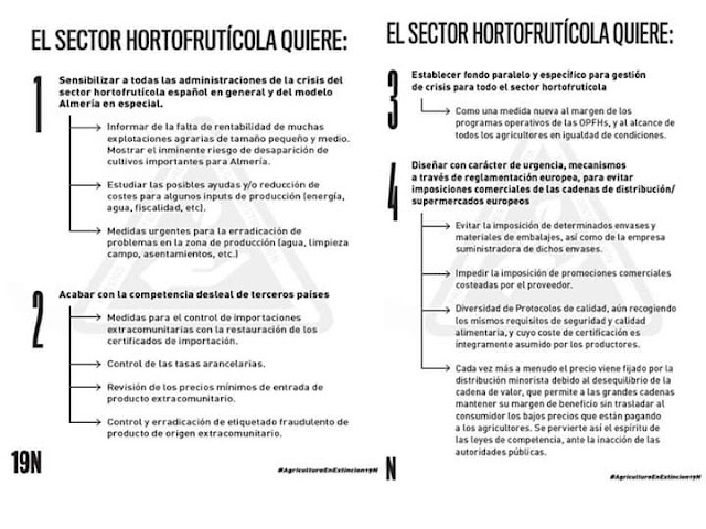 Otras entidades se han venido sumando al paro como la Mesa del Agua o la Unión de Agricultores independientes que ha pedido «el cierre de las alhóndigas el día después del paro, para que no se beneficien los que no participen». También Cooperativas de Granada convoca a la movilización del sector hortofrutícola y ha concentrarse en la Plaza Aurora de Motril. Y el sindicato UGT ha publicado un comunicado. «Nos sumamos a la manifestación del 19N en Almería en defensa del sector hortofrutícola de nuestra provincia. Es responsabilidad de todos. La calidad del sector también redunda en el bienestar de los trabajador@s. «