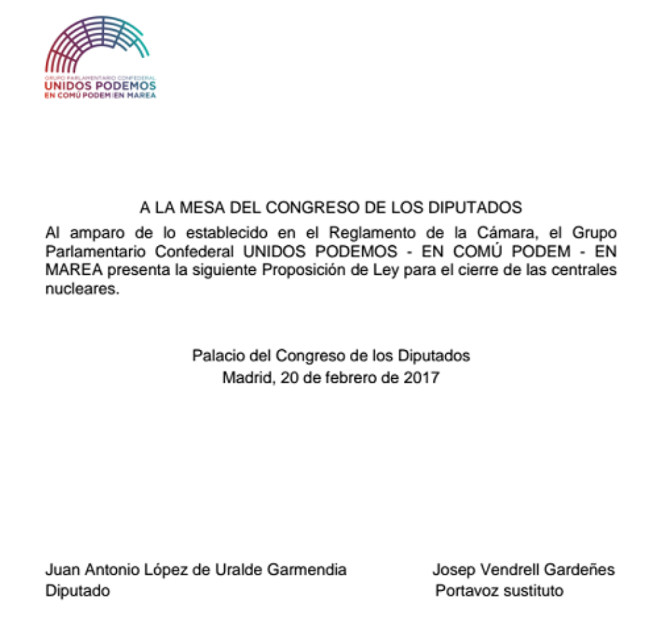 El grupo confederal Unidos Podemos – En Comú Podem – En Marea ha registrado esta mañana una Proposición de Ley para el cierre progresivo de las centrales nucleares. Esta Propuesta establece que el cese de explotación de las centrales nucleares se producirá en el momento en el que expiren las autorizaciones de explotación actualmente vigentes al final de su vida útil.
