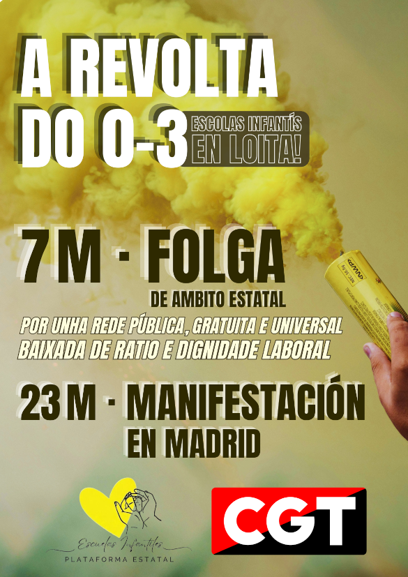 CGT ha anunciado la convocatoria de una huelga el 7 de mayo para los y las trabajadoras del llamado 0-3, el primer ciclo de la Educación Infantil. CGT responde así al llamamiento de apoyo en la lucha que las trabajadoras del sector, agrupadas en la Plataforma Estatal de Escuelas Infantiles (PEEI) ha realizado a dicha organización sindical.