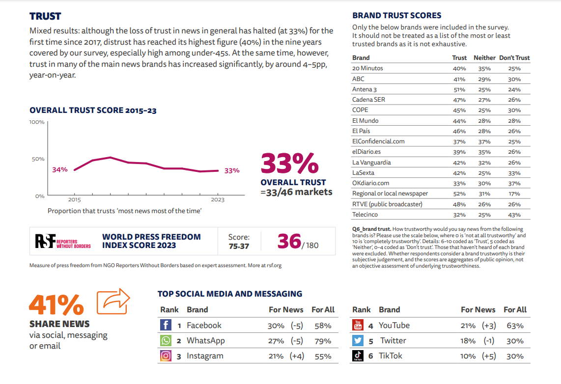 La desconfianza en las noticias de los medios de comunicación en España alcanza su cifra más alta en nueve años, según el Informe Digital News Report 2023