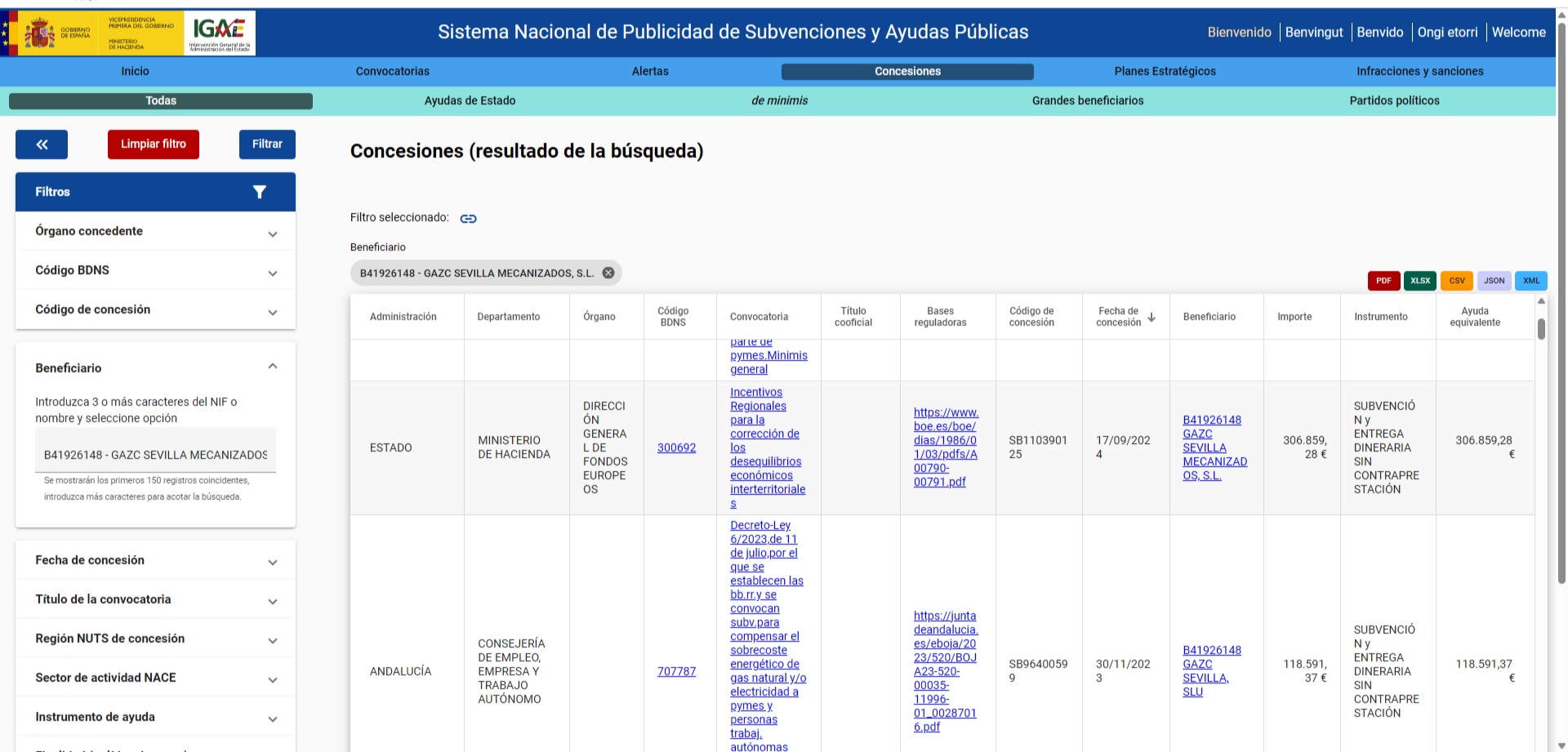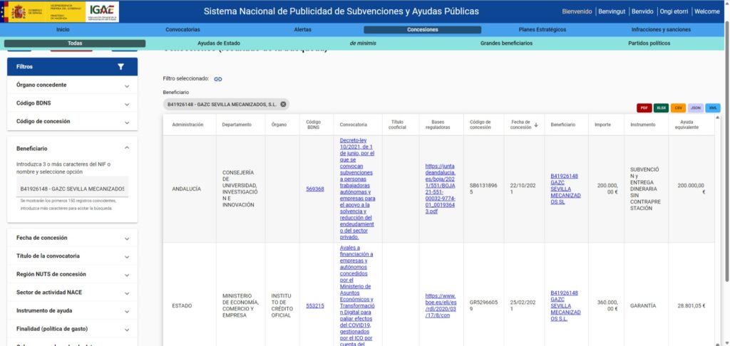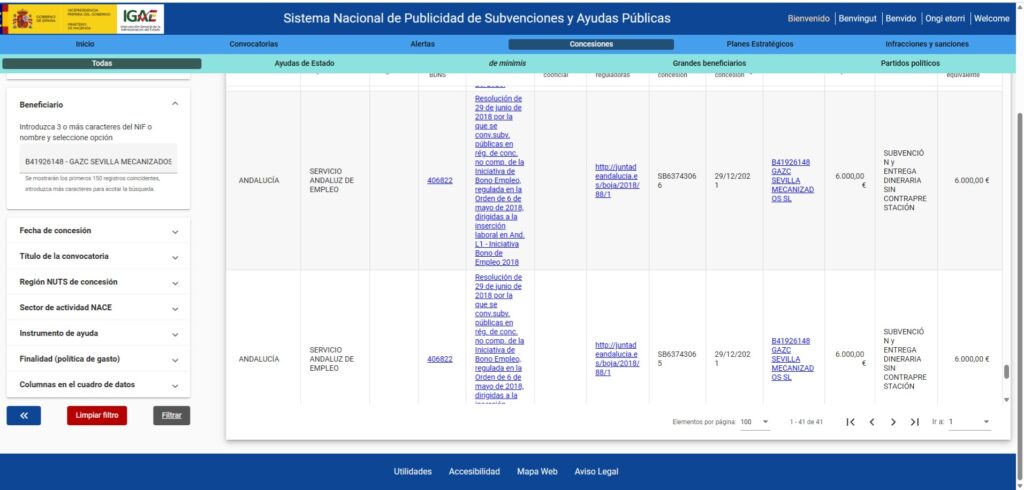 Documentación sobre ayudas públicas obtenidas a través de InfoSubvenciones.