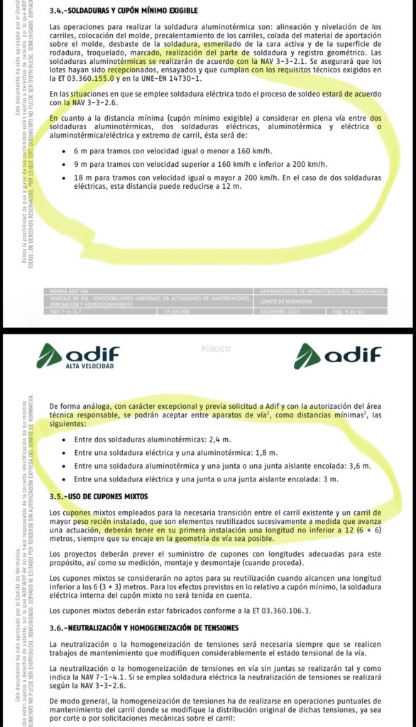 La NAV 7-1-3.7 sobre Montaje de Vía, consideraciones generales en actuaciones de mantenimiento, renovación y acondicionamiento, recoge exhaustivamente el modo de proceder al efecto en las vías ferroviarias y en concreto en su apartado 3.4, especifica las distancias mínimas entre soldaduras aluminotermicas, eléctricas y en las excepciones contempladas previa autorización de ADIF y en ningún caso se permiten las distancias que aparecen en las fotos.