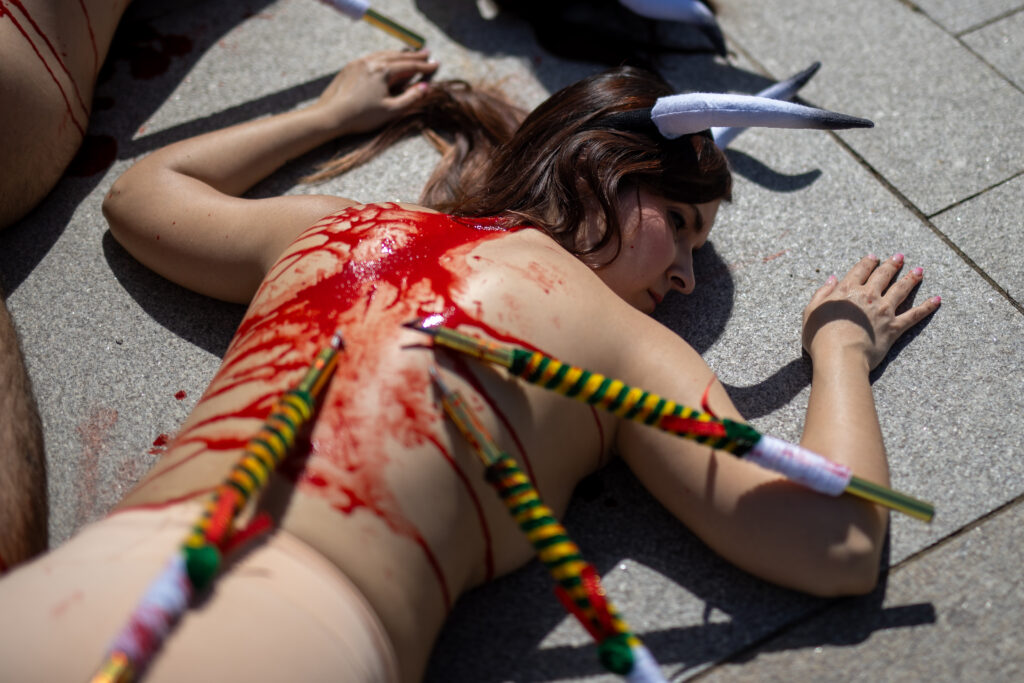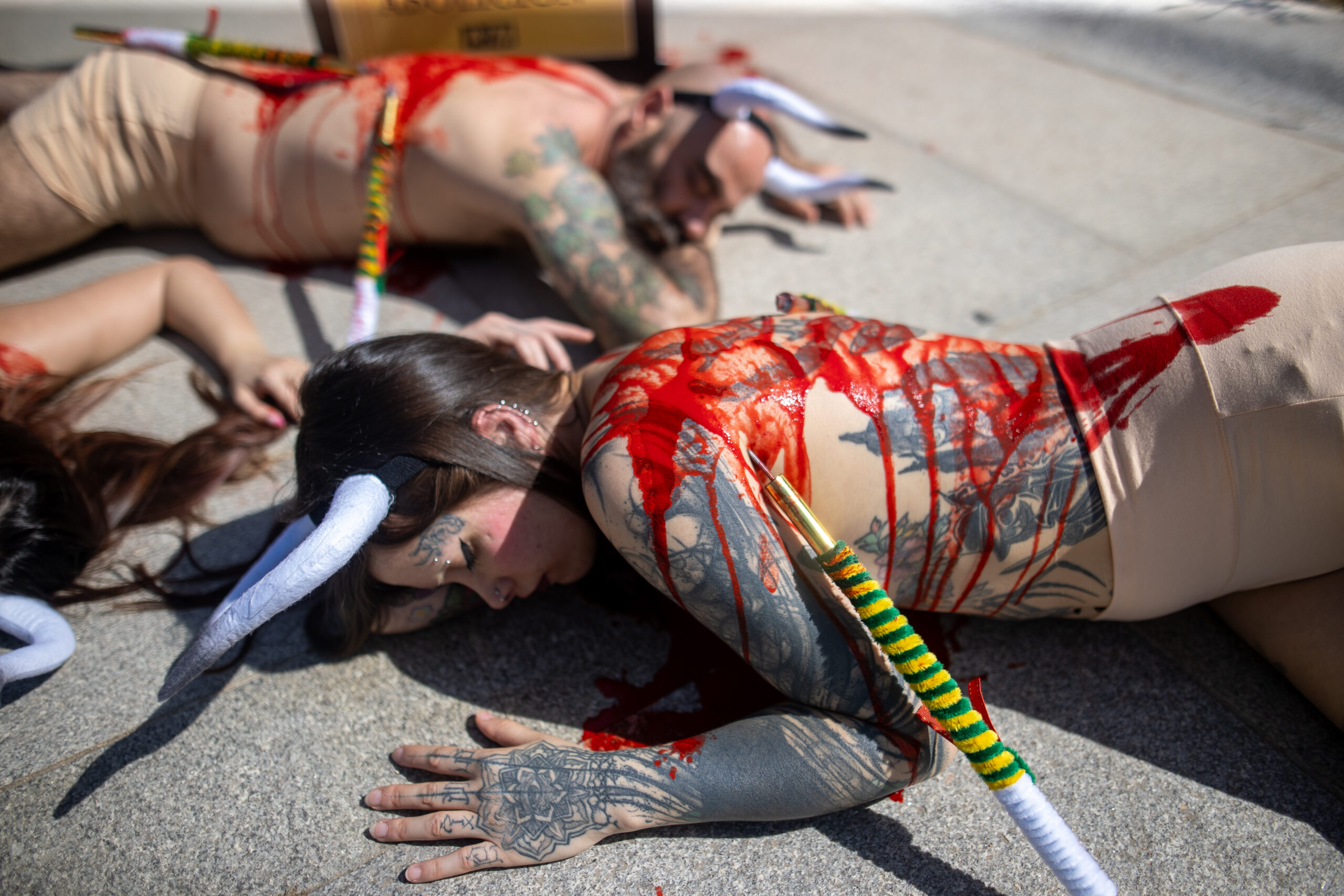 Madrid – Vestidos como toros ensangrentados, simpatizantes de PETA se congregaron ayer frente al Senado durante la entrega del Premio Nacional de Tauromaquia y yacieron en el suelo “muertos”, con banderillas clavadas en la espalda, alrededor de un enorme trofeo falso con el mensaje “Premio a la Vergüenza Nacional: Tauromaquia Abolición”. Los defensores de los animales criticaron el vergonzoso galardón, reactivado en el Senado tras haber sido eliminado oficialmente en 2024, por premiar la tortura despiadada y la matanza violenta de toros.