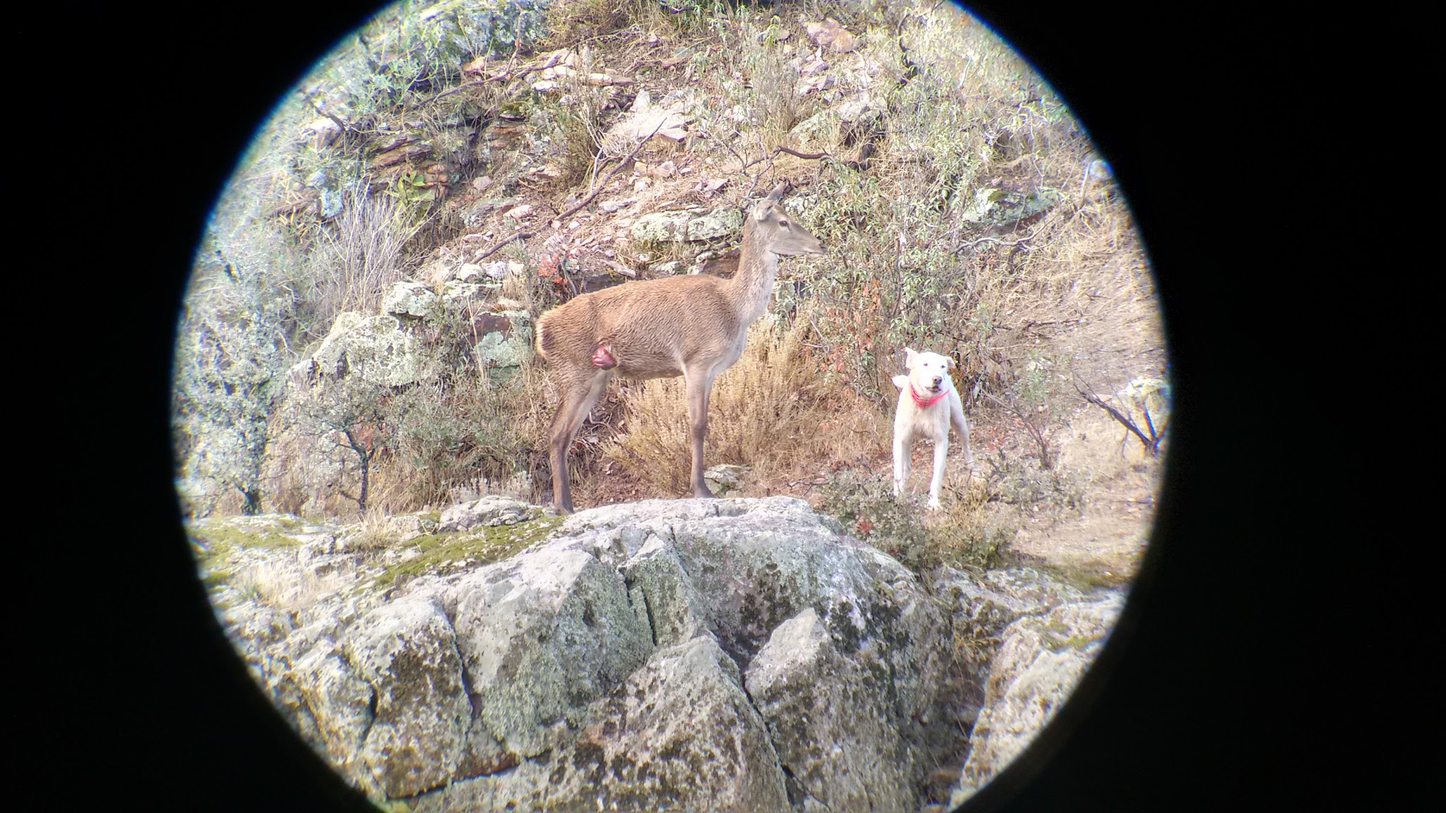 | Cierva herida acosada por perro de rehala en un mirador del Parque Nacional |