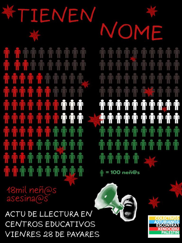 Después de los actos de ayer de lectura de cincuenta nombres de niñ@s palestin@s en todo los campus de la Universidá d’Uviéu, hoy viernes 28 en 19 centros de secundaria de toda Asturies igualmente se procederá a la lectura de nombres en un acto sencillo pero expresivo, en el momento del recreo, respondiendo a la convocatoria al ámbito educativo de esta iniciativa solidaria con Palestina y testimonio de l@s 18.000 menores víctimas de un drama que no acaba. Como posibles referentes a medios de comunicación apuntamos tres centros, dos de ellos en Xixón, y en cuyos actos van a utilizar mortajas del acto del 11 de octubre en el Niemeyer, y el tercero en La Felguera; María Rodríguez es además una de las responsables de esta campaña.