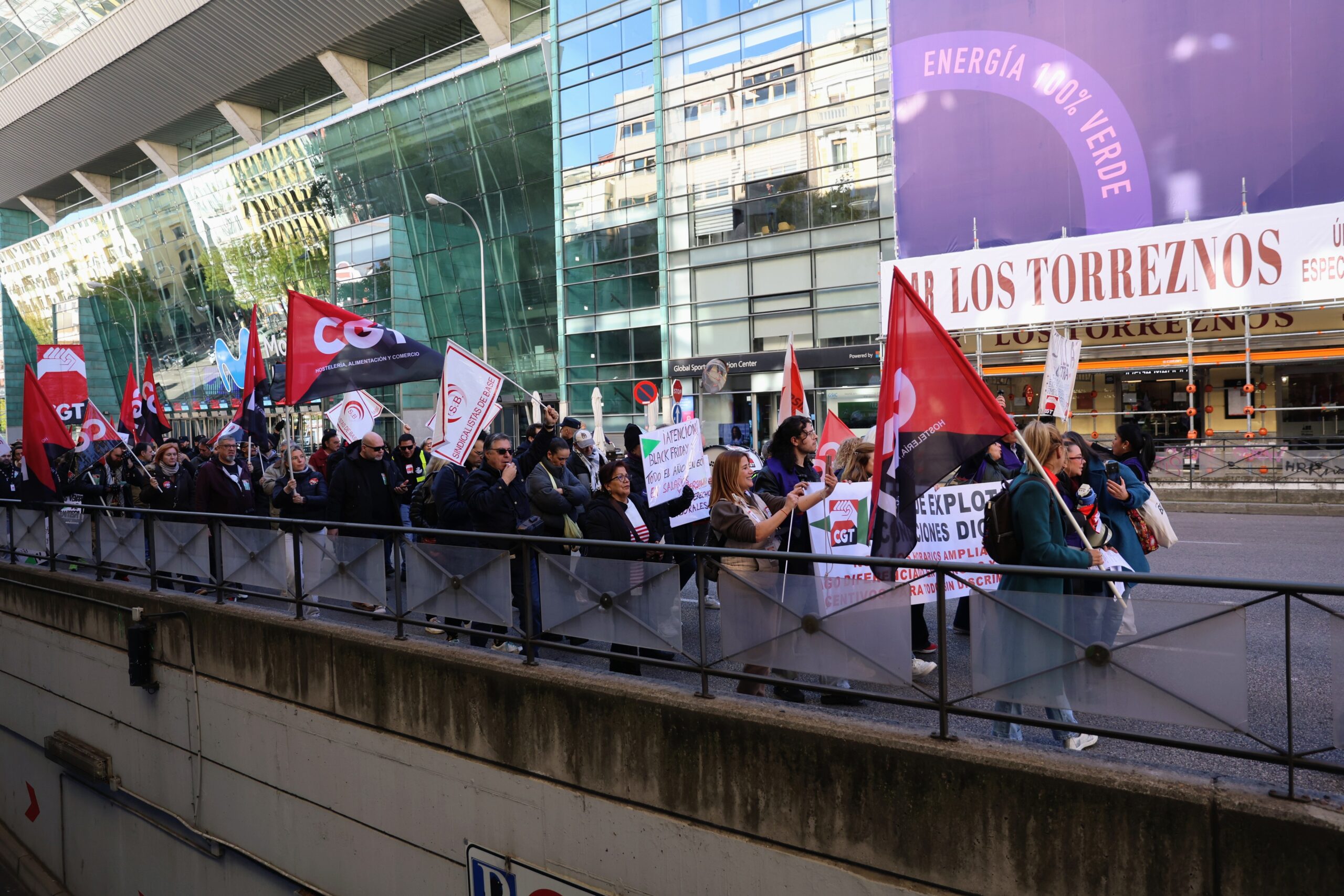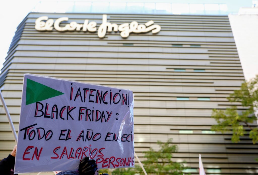 La sección sindical de la Confederación General del Trabajo (CGT) ha logrado movilizar a varios centenares de personas en la concentración que ha tenido lugar este viernes, 28 de noviembre, en las puertas de las tiendas situadas en la calle Goya de Madrid.