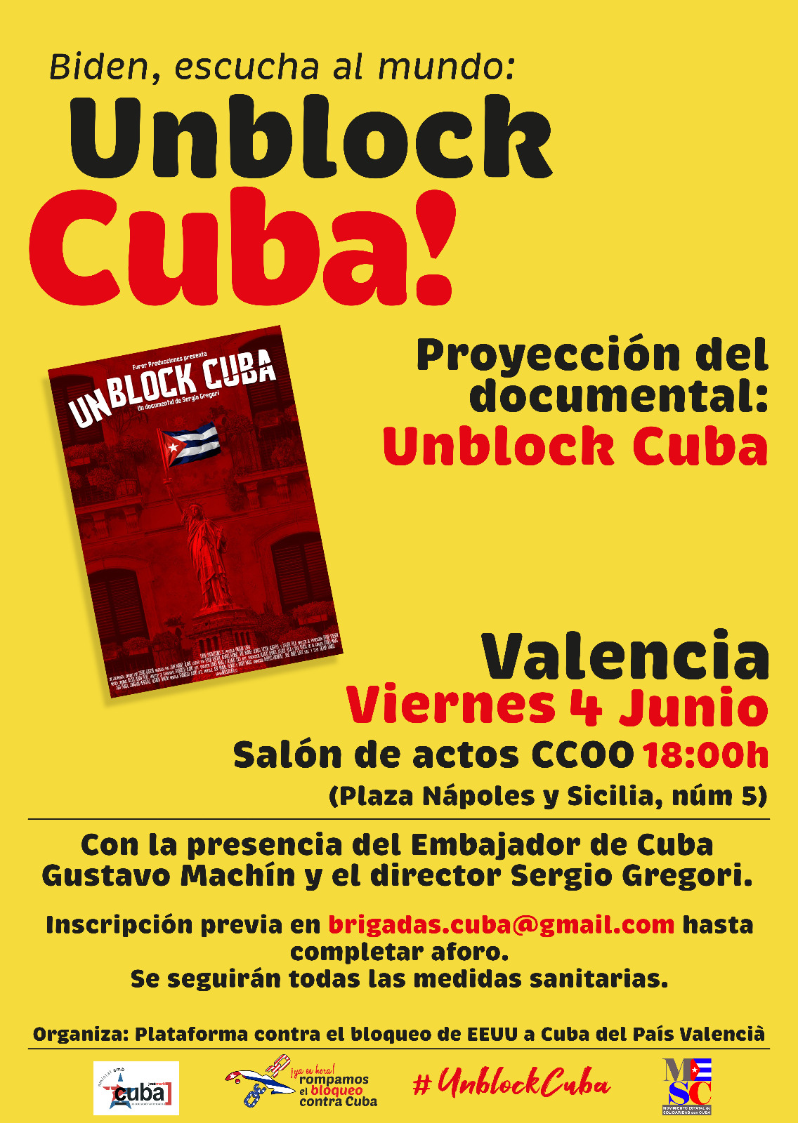 – Viernes 4 de junio: 18’00 h. Proyección del documental “Unblock Cuba”, con presencia del Embajador de Cuba Gustavo Machín, y del director Sergio Gregori. Será en el Salón de Actos de CCOOPV (Plaça Nàpols i Sicília, 5, València). Se hará con inscripción previa hasta completar el aforo con las personas que acudan al acto, y respetando las medidas sanitarias. Las inscripciones hay que hacerlas en el correo brigadas.cuba@gmail.com
