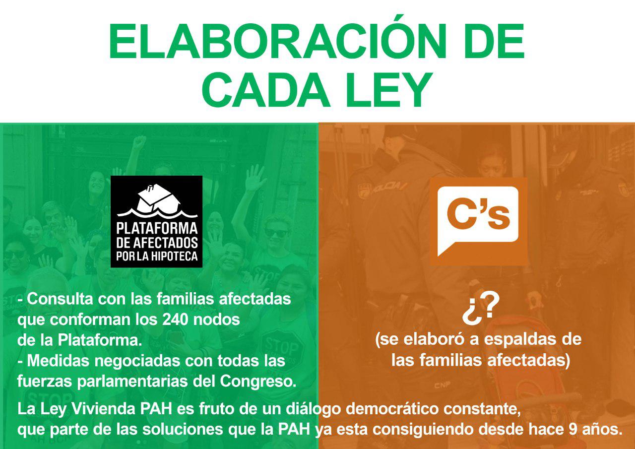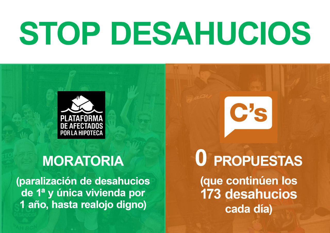 Un partido como Ciudadanos, que miente sobre sus responsabilidades políticas, es un partido que solo piensa en su imagen, mientras cada día siguen desahuciando a 173 familias. Por si fuera poco el engaño perpretado, Ciudadanos ha respondido con una campaña de desprestigio a la Ley Vivienda PAH, promoviendo a la vez una ley propia de segunda oportunidad: una ley para la que no han consultado con las familias, que no incluye medidas retroactivas para cancelar deudas de por vida de familias que han sido desahuciadas, que no incluye ninguna medida para acabar con los desahucios y que pretenden utilizar como coartada para impedir el debate democrático de la Ley Vivienda PAH.