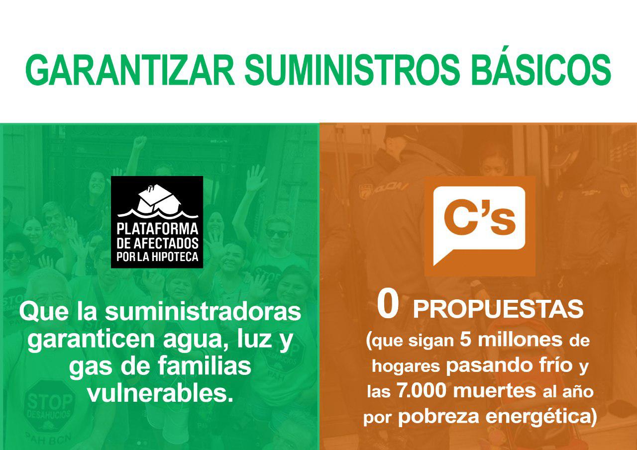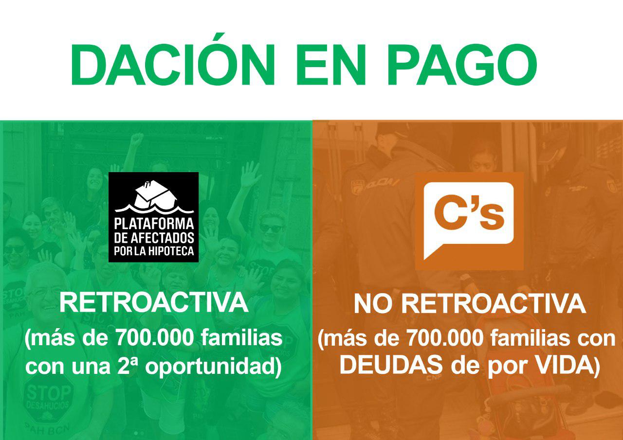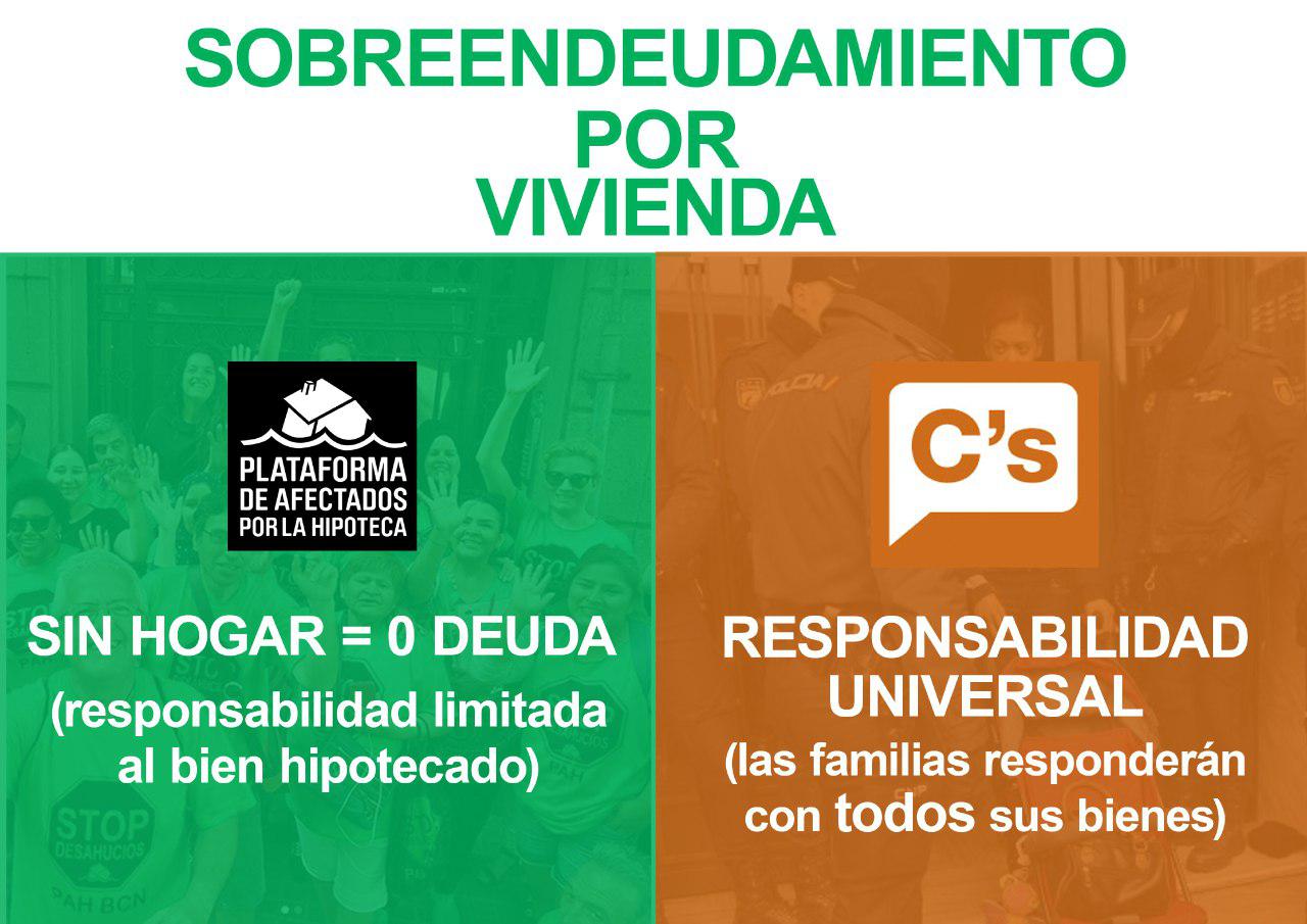 Un partido como Ciudadanos, que miente sobre sus responsabilidades políticas, es un partido que solo piensa en su imagen, mientras cada día siguen desahuciando a 173 familias. Por si fuera poco el engaño perpretado, Ciudadanos ha respondido con una campaña de desprestigio a la Ley Vivienda PAH, promoviendo a la vez una ley propia de segunda oportunidad: una ley para la que no han consultado con las familias, que no incluye medidas retroactivas para cancelar deudas de por vida de familias que han sido desahuciadas, que no incluye ninguna medida para acabar con los desahucios y que pretenden utilizar como coartada para impedir el debate democrático de la Ley Vivienda PAH.