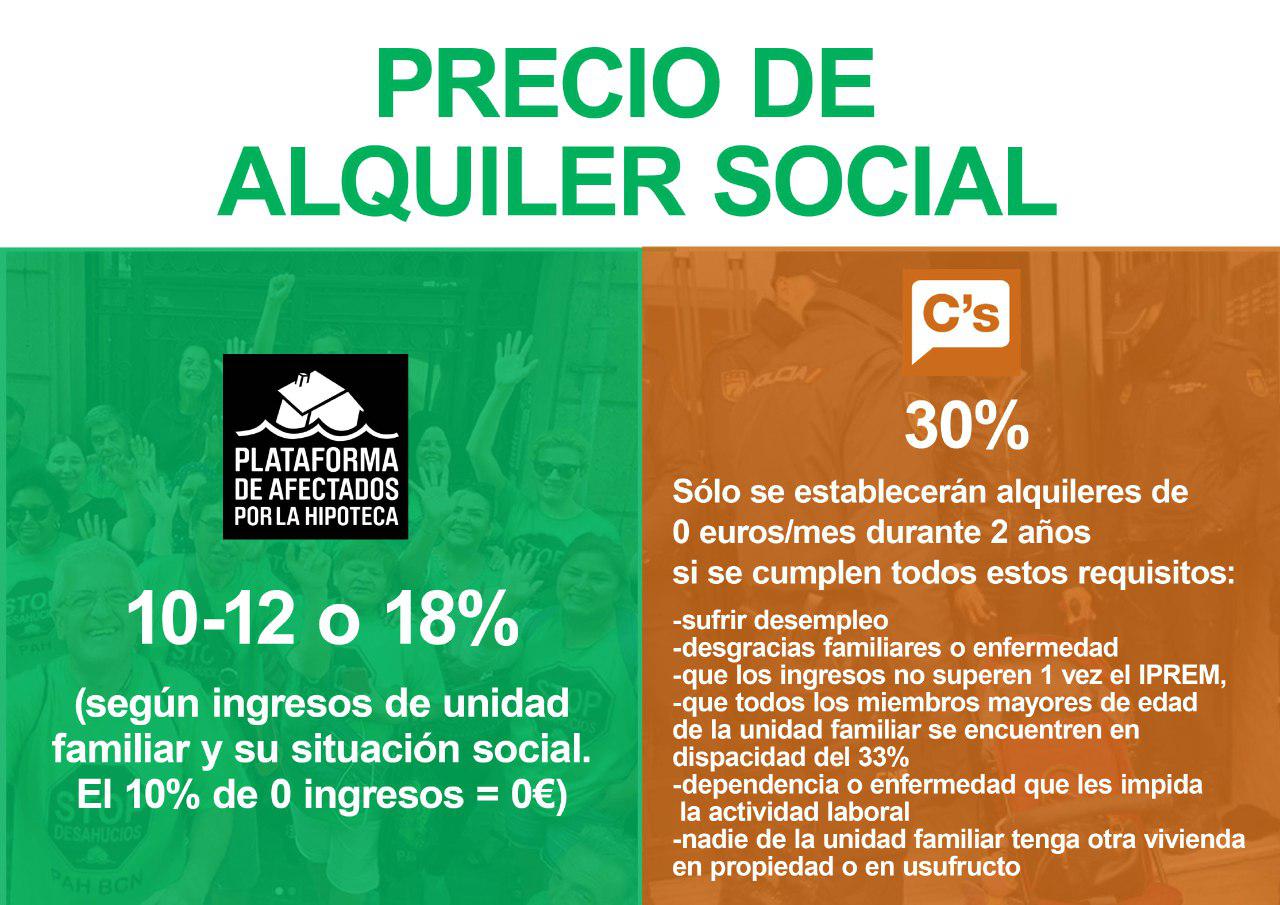 Plataformas en municipios de todo el Estado, nos movilizaremos esta semana frente a las sedes de Ciudadanos interpelando para que voten a favor de la tramitación de la Ley Vivienda PAH en la Mesa del Congreso. El pasado viernes, 16 de febrero, el Partido Popular solicitó un veto a la Ley Vivienda PAH: una propuesta de ley que de legislarse acabaría con los desahucios, las subidas abusivas de los alquileres, los cortes de suministros y ampliaría el parque público de vivienda equiparándolo a la media europea.