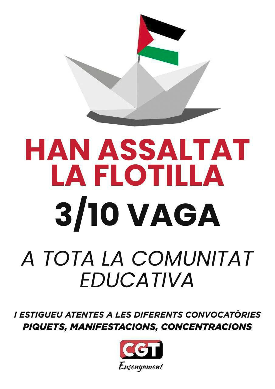 CGT Ensenyament convoca vaga en solidaritat amb Palestina al sector el dia 3 d’octubre. La vaga, que serà de tota la jornada, convoca a docents i PAE dels centres educatius públics, universitats i del sector del lleure.