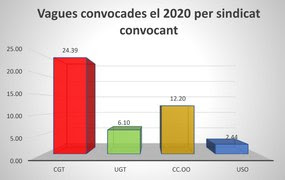 Ponderant els percentatges de convocatòries segons la implantació real, el 2020 la CGT va convocar com a sindicat un +804% del percentatge de vagues que caldria esperar en funció de la seva presència a empreses, mentre que CCOO ho va fer un 29,46% del seu pes relatiu, UGT el 16,26% i USO un 47,92%