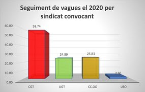 Pel que fa al seguiment en vagues del darrer any amb dades, 2020, i tenint en compte igualment la ponderació segons representativitat, el percentatge de seguiment de les vagues convocades per la CGT suposen un +1938,78% del seguiment que caldria esperar en funció de la seva presència a empreses, mentre que el seguiment ponderat de les convocades per CCOO representa un 62,39% del seu pes relatiu en representativitat, UGT el 66,38% i USO un 49,06%