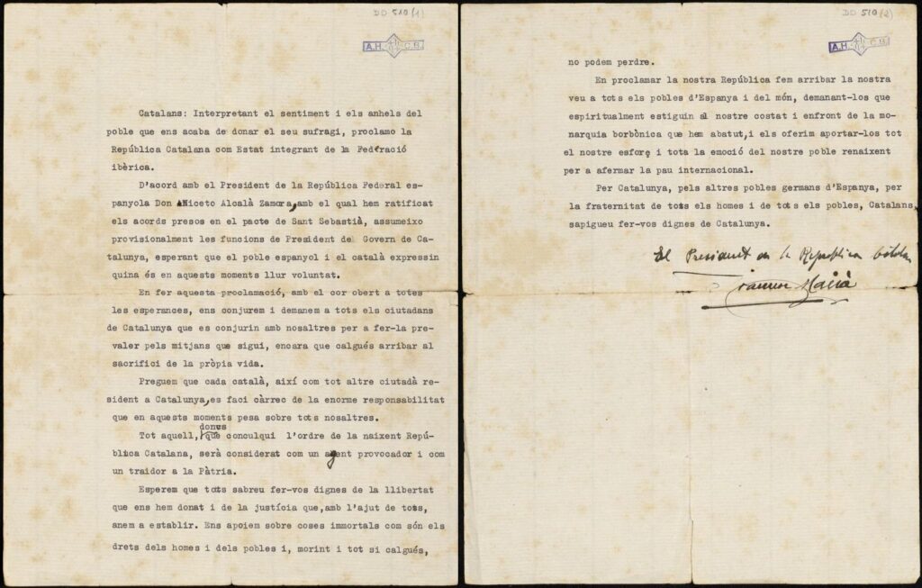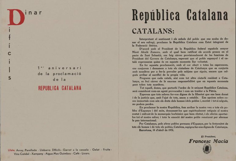 Cerca de las dos de aquel 14 de abril, el jefe de la lista más votada en las elecciones municipales en Barcelona, Lluís Companys, proclamaba la República desde el balcón del Ayuntamiento. Enterado de este hecho, Francesc Macià, contrariado por la iniciativa unilateral de su compañero de filas en el Ayuntamiento, quiso ir un paso más allá y proclamó desde el balcón de la entonces sede de la «Diputación Provincial», «La República catalana a la espera de que los otros pueblos de España se constituyan como Repúblicas, para formar a la Confederación Ibérica».