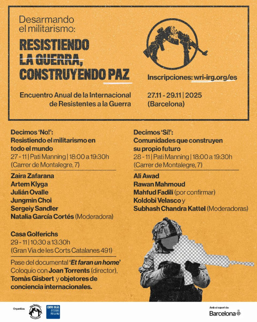 El encuentro anual de la Internacional de Resistentes a la Guerra (IRG) tendrá lugar del 26 al 29 de noviembre en Barcelona bajo el título «Desarmando el militarismo: resistiendo la guerra, construyendo la paz».