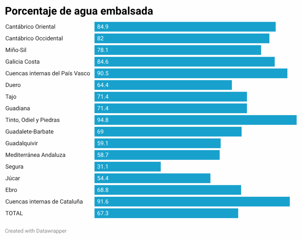 De acuerdo con los datos facilitados por MITECO, en este momento, todas las cuencas salvo la del Segura (que está al 31,1 %) se encuentran por encima del 54 % de su capacidad, 9 de ellas superan el 70 % y 3 acumulan más del 90 %.