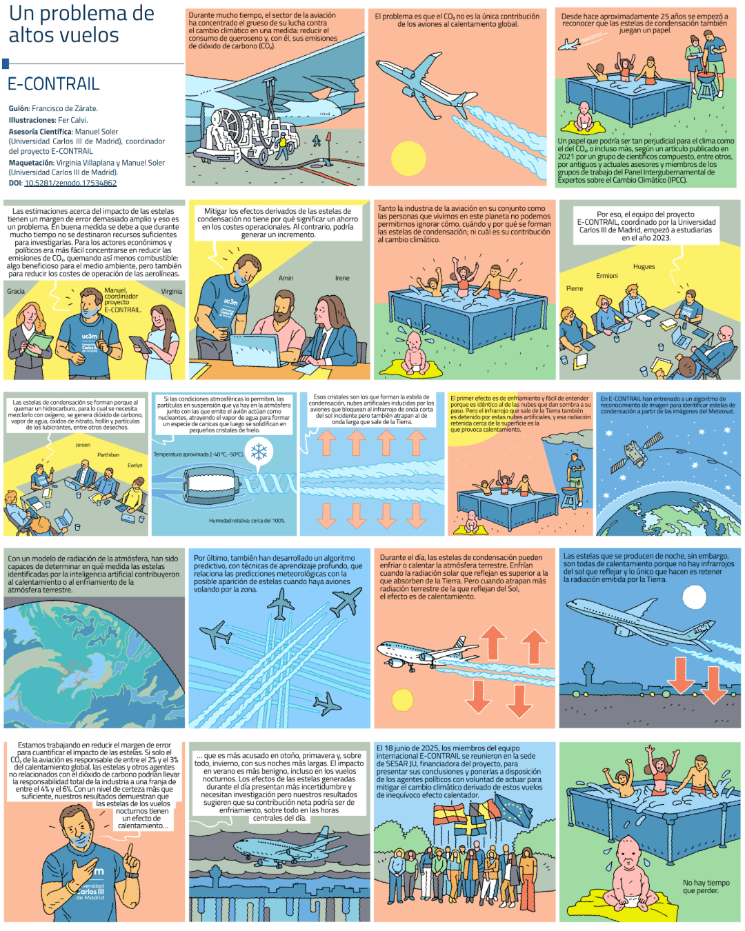 La combinación de observación satelital e IA está permitiendo avanzar en el seguimiento global de estos fenómenos, aunque su traducción en políticas climáticas todavía es limitada. En este contexto, Soler Arnedo, junto con el resto de científicos del proyecto E-CONTRAIL, ha publicado un informe titulado Making Contrails Visible, con resultados y recomendaciones a escala política.