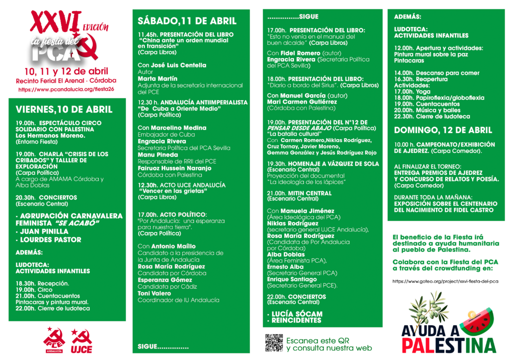 8 de abril de 2026.- El Partido Comunista de Andalucía hace pública la programación completa de la XXVI Edición de la Fiesta del PCA, que tendrá lugar los días 10, 11 y 12 de abril en el Recinto Ferial “El Arenal” de Córdoba. Un evento consolidado como uno de los principales espacios de encuentro político, cultural y social de Andalucía, que combina reflexión crítica, celebración popular y compromiso militante. Asimismo, uno de los “platos fuertes” será el acto de Por Andalucía, la coalición electoral encabezada por Antonio Maíllo a las próximas elecciones del 17 de mayo.