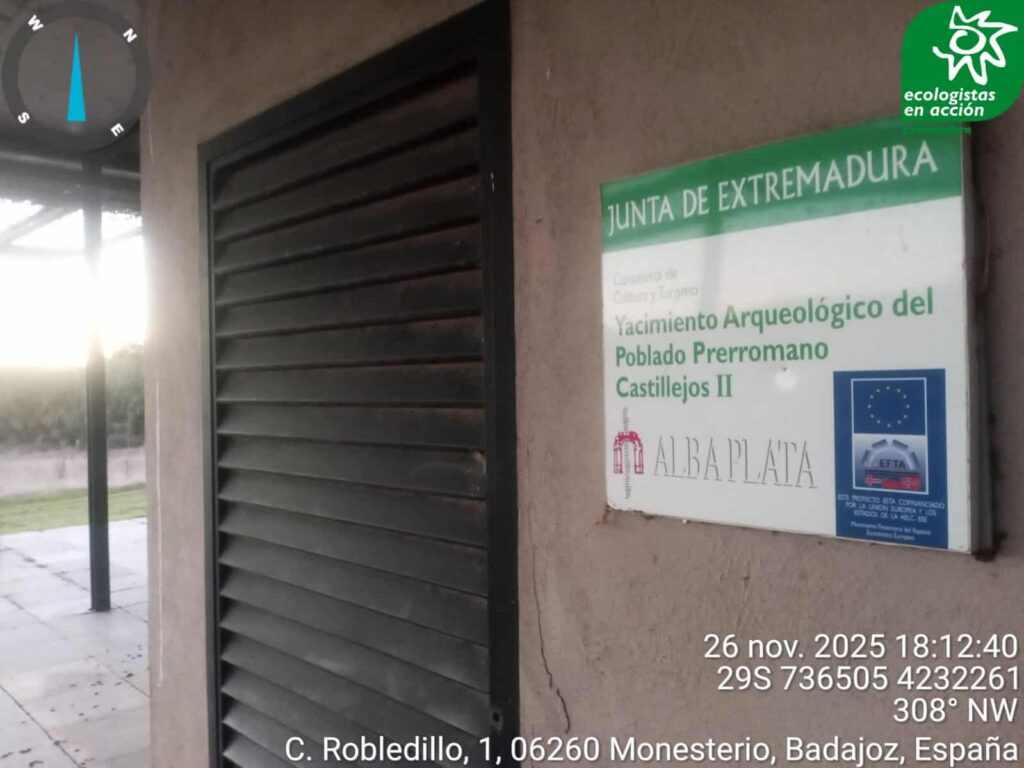 Ecologistas en Acción de Extremadura denuncia el estado de abandono, ruina y de desvalijamiento del centro de interpretación-oficinas del yacimiento arqueológico prerromano de los castillejos II en Fuente de Cantos, situado en la vía de la Plata.