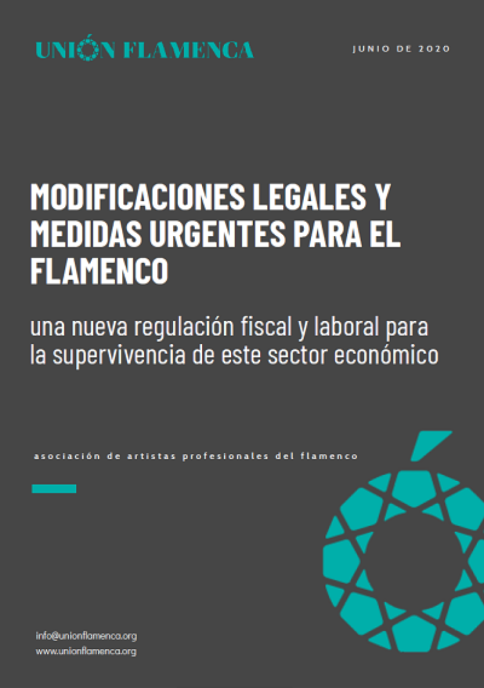 Viernes, 19 de junio de 2020. Unión Flamenca, la Asociación de Artistas Profesionales del Flamenco, ha elaborado el documento Modifcaciones legales y medidas urgentes para el famenco: una nueva regulación fscal y laboral para la supervivencia de este sector económico. El texto, que analiza la situación del colectivo de artistas profesionales del famenco, propone cinco bloques de medidas legales a nivel laboral y fscal: fomentar la creación y la contratación artística; mejorar los derechos laborales y la fscalidad de quienes trabajan profesionalmente en el famenco y, por último, medidas de control, coordinación y mejora de ese sector económico a través de la Mesa Permanente del Flamenco. Desde Unión Flamenca han explicado que este informe persigue tres objetivos: fomentar la creación famenca (o materia prima); procurar el sostenimiento estable, seguro y protegido de quienes trabajan en el famenco (o mano de obra) e incentivar la contratación del producto o servicio.