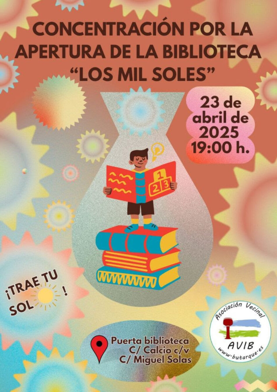 Coincidiendo con la celebración del Día Internacional del Libro, asociaciones vecinales y entidades educativas del distrito de Villaverde han convocado una concentración el próximo 23 de abril, a las 19:00, frente a las puertas de la Biblioteca Pública Municipal Los Mil Soles, situada en la calle Calcio, 1 del barrio de Butarque. Las entidades convocantes exigen una explicación a los responsables municipales ante la demora en la apertura de equipamiento cuyas obras finalizaron hace ya cuatro meses, pero aún permanece cerrado sin una justificación oficial.