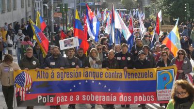 Máis de 2.000 persoas mobilizáronse onte en Santiago de Compostela ao berro de “o imperialismo é terrorismo” para rexeitar a agresión militar dos Estados Unidos a Venezuela e para esixir a inmediata posta en liberdade do seu presidente, Nicolás Maduro, e da deputada Cilia Flores. A marcha, convocada pola Asociación Galego-Bolivariana Hugo Chávez e outras organizacións sindicais, políticas e sociais baixo o lema ‘Non ás agresións ianquis a Venezuela, pola paz e a soberanía dos pobos’, percorreu as principais rúas da capital de Galiza ao mediodía para trasladarlle unha mensaxe de solidariedade e de apoio ao pobo venezolano que resiste fronte aos ataques do imperialismo estadounidense.