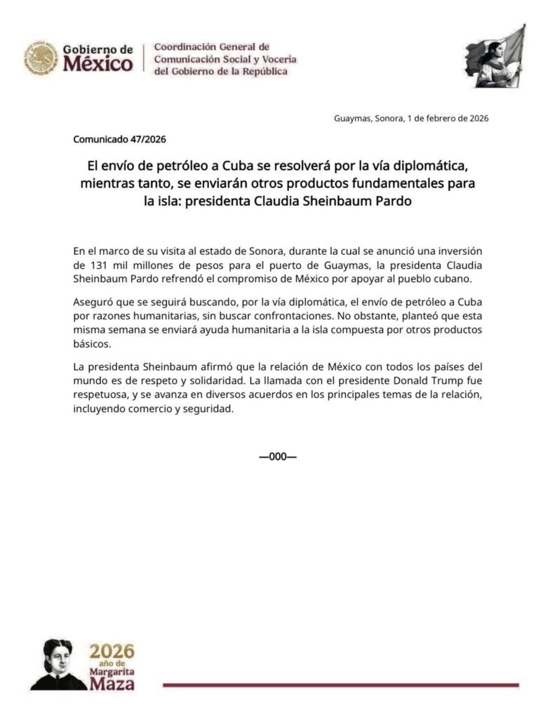 De acuerdo con el documento, la presidenta Claudia Sheinbaum Pardo subrayó que su gobierno continuará explorando mecanismos diplomáticos para concretar el envío de petróleo a Cuba por razones humanitarias, evitando cualquier escenario de confrontación.