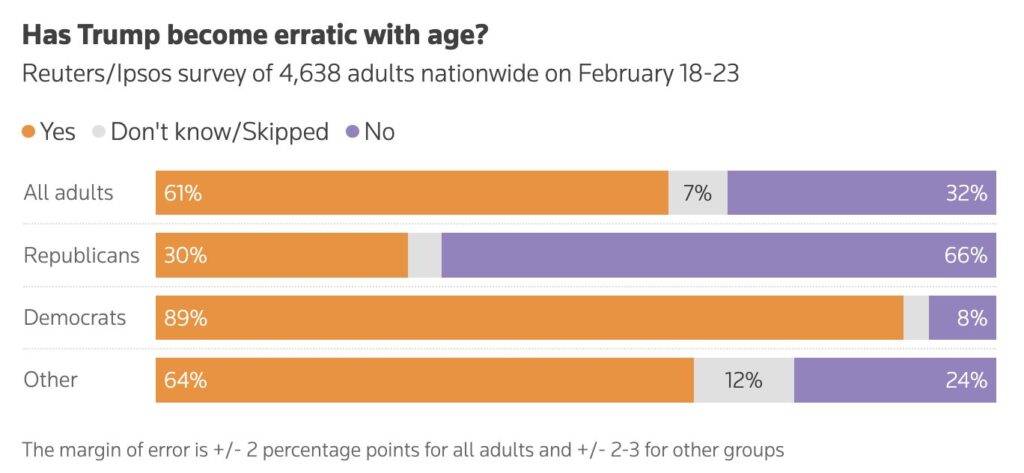 Además, otra encuesta del pasado 18 a 23 de febrero indicaba que el 61% de los estadounidenses creen que Trump se está volviendo más «errático» con la edad;