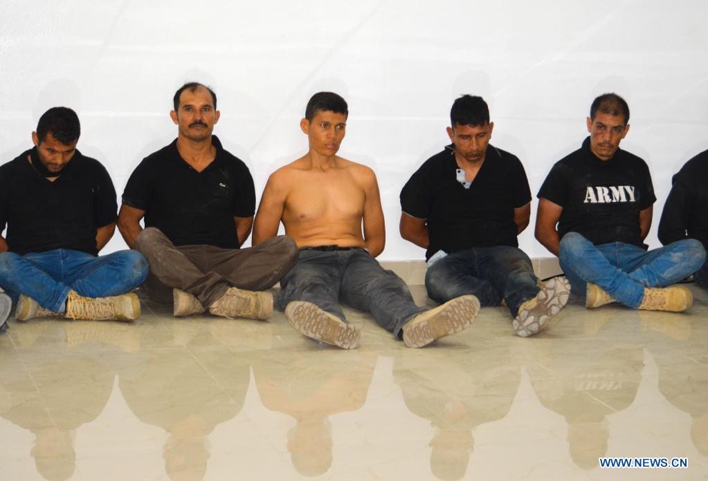 Los presuntos implicados en el asesinato del presidente haitiano, Jovenel Moise, son presentados durante una conferencia de prensa, en Puerto Príncipe, Haití, el 8 de julio de 2021. La Policía de Haití detuvo a 15 colombianos y a dos estadounidenses de origen haitiano que estarían implicados en el asesinato del presidente de Haití, Jovenel Moise, informaron el jueves fuentes oficiales. (Xinhua/Tcharly Coutin)
