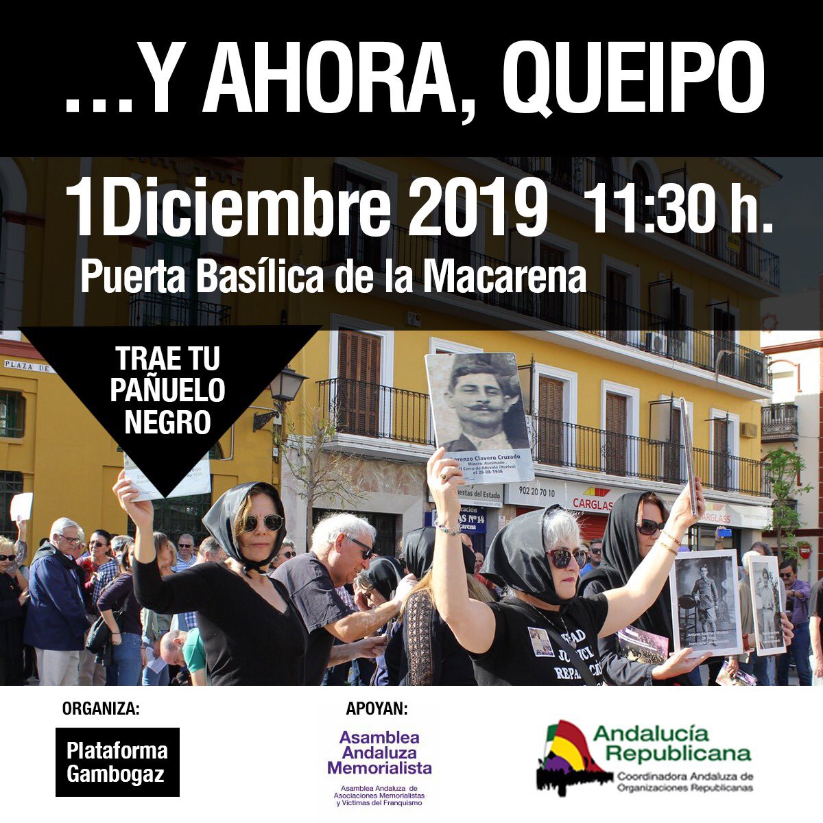 - El lunes 14 de junio, a las 20 horas, conmemoraremos el Día de la Memoria en Andalucía realizando una concentración donde, una vez más, exigiremos ¡Fuera Queipo de la Macarena!