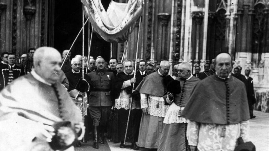 Franco bajo palio a la salida de un templo.