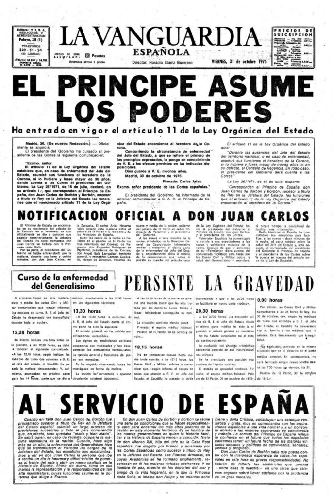 Ahora que el Gobierno está conmemorando los 50 años de España en Libertad conviene recordar que el próximo día 30 de octubre se cumplirán 50 años del día en el que Juan Carlos de Borbón asumió la jefatura del Estado de la dictadura franquista por baja por enfermedad del dictador Francisco Franco. Era la segunda ocasión en la que Juan Carlos de Borbón se convertía en jefe de Estado de la dictadura; la anterior había sido entre 19 de julio y el 2 de septiembre de 1974. Eso le convirtió en dirigente de la dictadura ocupando su jefatura de Estado por decisión y previsión del dictador que lo había elegido como su sucesor.