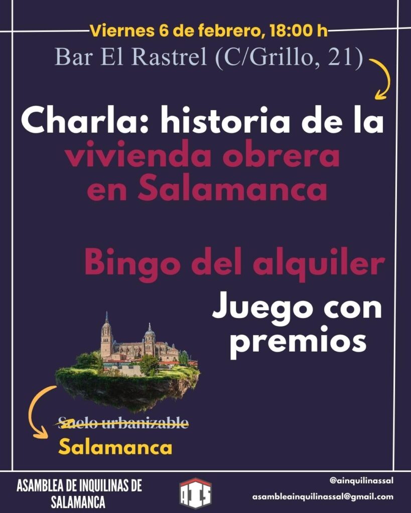 - La Asamblea de Inquilinas de Salamanca anuncia un acto este próximo viernes 6 de febrero en el bar El Rastrel (Calle Grillo 21) a partir de las 18.00, donde abordarán la evolución de la vivienda en Salamanca en los últimos 100 años.